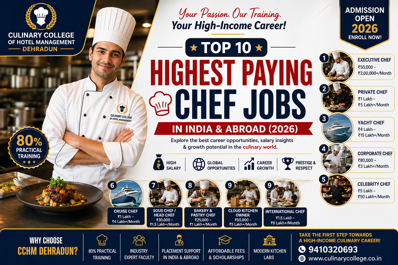 इस detailed guide में, Culinary College of Hotel Management (CCHM Dehradun) के expert perspective से हम आपको बताएंगे Top 10 Highest Paying Chef Jobs in 2026 — real salary insights के साथ।